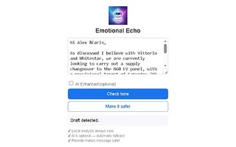 Emotional Echo is een handige browserextensie die gebruikers helpt de toon van hun e-mails te begrijpen voordat ze deze verzenden. Deze tool analyseert e-mailconcepten en biedt inzicht in hoe deze overkomen op de ontvanger. Met een enkele klik kan de gebruiker zien of de boodschap neutraal, stevig, druk of agressief klinkt. Dit is bijzonder nuttig in stressvolle situaties waarin de toon van een bericht gemakkelijk verkeerd geïnterpreteerd kan worden.